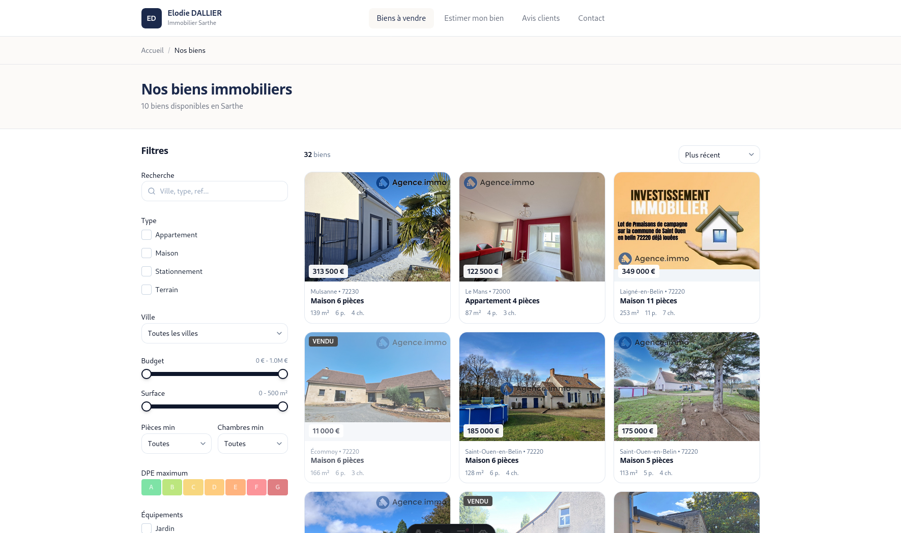 Elodie Dallier, agent immobilier indépendant en Sarthe, développe actuellement ses propres canaux d'acquisition clients. Nous créons une plateforme autonome avec estimation en ligne, catalogue de biens et système d'alertes pour lui permettre de capter directement vendeurs et acquéreurs.